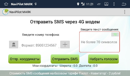 Кроме того, в приложении предусмотрена функция отправки SMS с магнитолы, Вы можете отправить свои координаты друзьям или любой текст (с установленной в модеме SIM карты).