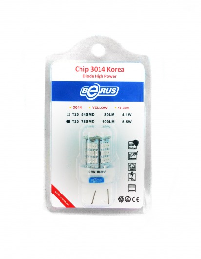 Светодиодная лампа T20 5.5W предназначена для установки в противотуманные фары и указатели поворотов. Она намного ярче обычных галогеновых ламп, отлично освещает дорогу даже в самую непроглядную темноту и сильный ливень. Цвет свечения со временем не изменяется. Служит такая лампа очень долго, при этом потребляет незначительное количество энергии.
