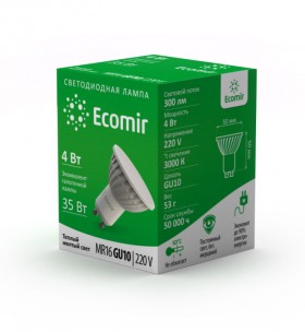 Светодиодная лампа Ecomir GU10 4W эквивалентна галогеновой лампе мощностью 35 Вт с цоколем MR16. Потребляемая мощность – всего 4 Вт, цветовая температура – 3000 К (это желтый свет). Световой поток — 300 лм. Напряжение — 220 В. Матовый рассеиватель. Угол освещения > 90°.