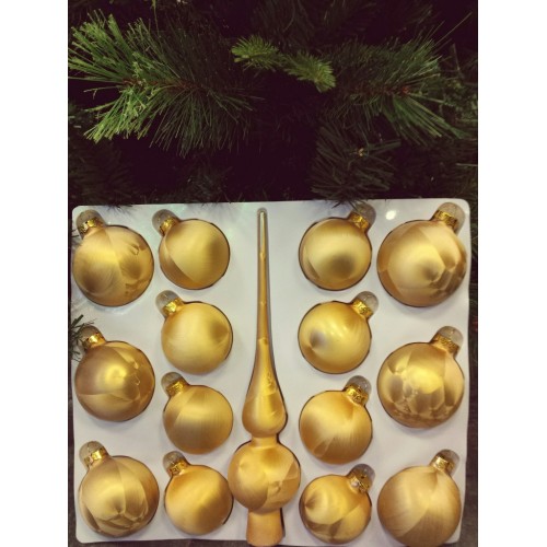 В набор PeneriGifts входит верхушка для елки и 14 шаров диаметром 6 и 7 см. Этого более чем достаточно, чтобы целиком нарядить даже самую высокую домашнюю ель. И вам не придется долго подбирать елочные украшения — в наборе есть все, что нужно. Даже не обязательно добавлять мишуру — любая елка и без нее будет выглядеть элегантно и самодостаточно. Матовые золотистые шарики из стекла смотрятся добротно, нарядно и гармонично. А легкие узоры из "инея" придают им особый шарм.