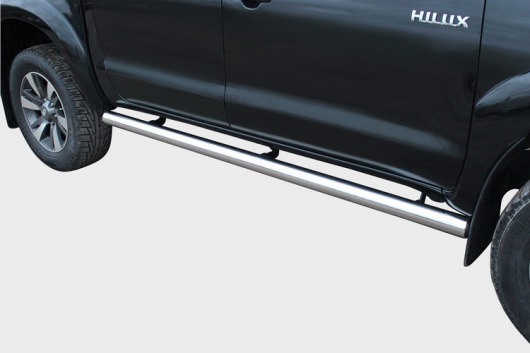 Пороги на Toyota Hilux – это боковые подножки из нержавеющей стали диаметром 76 мм, которые позволяют более комфортно входить и выходить из салона автомобиля. Подножки Toyota Hilux очень прочные, надежные и долговечные: они не боятся коррозии, сколов и царапин и выдерживают большие нагрузки.