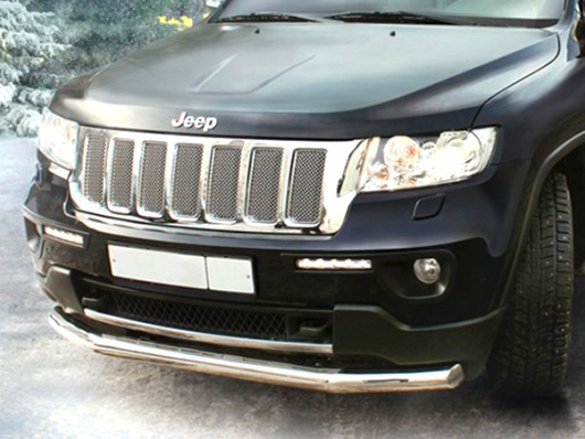 Защита переднего бампера труба предназначена для автомобилей Jeep Grand Cherokee от 2011 г.в. Вам не придется подгонять защиту под размеры бампера вашего авто. И с монтажом проблем не возникнет: установка защиты переднего бампера производится в штатные отверстия, а значит, необходимость сверлить кузов отпадает.