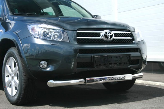 Труба на бампер Toyota RAV4 защищает передний бампер автомобиля от различных механических повреждений при мелких ДТП и неудачных парковках, а также незаменима при езде по бездорожью. А кроме этого, труба на передний бампер Тойота РАВ4 смотрится очень стильно и эффектно.