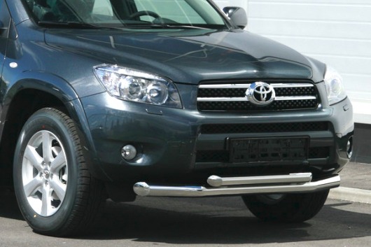Защита переднего бампера труба предназначена для автомобилей Toyota RAV4 от 2006 г.в. Вам не придется подгонять защиту под размеры бампера вашего авто. И с монтажом проблем не возникнет: установка защиты переднего бампера производится в штатные отверстия, а значит, необходимость сверлить кузов отпадает.