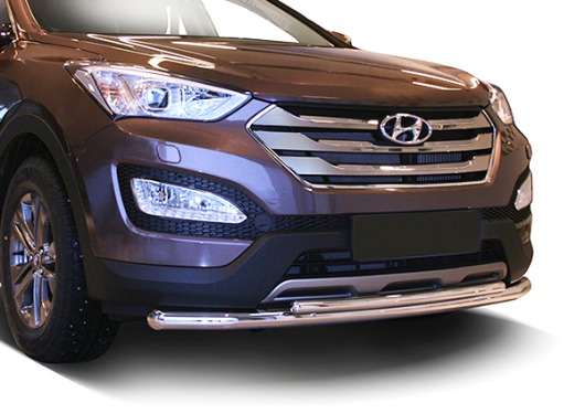 Защита переднего бампера труба предназначена для автомобилей Hyundai Santa Fe от 2013 г.в. Вам не придется подгонять защиту под размеры бампера вашего авто. И с монтажом проблем не возникнет: установка защиты переднего бампера производится в штатные отверстия, а значит, необходимость сверлить кузов отпадает.