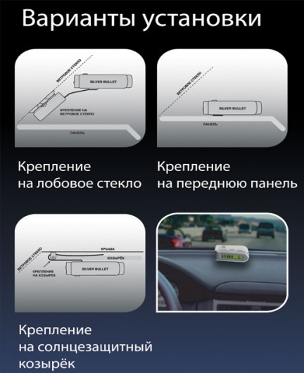 Производителем предусмотрено три варианта крепления этого устройства. Первый - это крепление на лобовое стекло при помощи кронштейна и присосок. Второй - крепление на приборную панель с помощью специальных липучек. А третий способ - это монтаж прибора на солнцезащитный козырек при помощи клипсы. Все необходимые для установки элементы входят в комплект поставки.