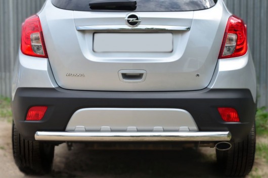 Труба на задний бампер Opel Mokka защищает задний бампер автомобиля от различных механических повреждений при столкновениях на дороге и неудачных парковках. А кроме этого, защита заднего бампера для Опель Мокка — это дополнительная деталь тюнинга.