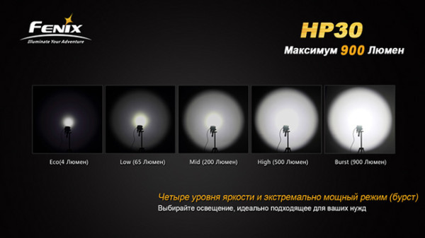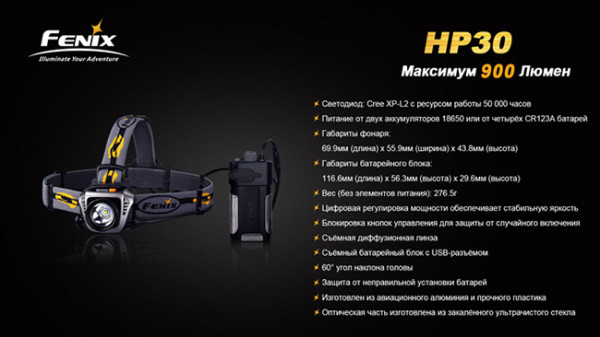 Налобный фонарь Fenix HP30 – уникальная модель. Обладая абсолютно беспрецедентной мощностью в 900 люмен, этот налобный светодиодный фонарь является безоговорочно номером один в своём классе по яркости. Это делает модель оптимальным выбором для охотников, рыболовов, спелеологов, альпинистов. Помимо этого, у Fenix HP30 есть несколько уникальных свойств – с него можно даже заряжать мобильные устройства!