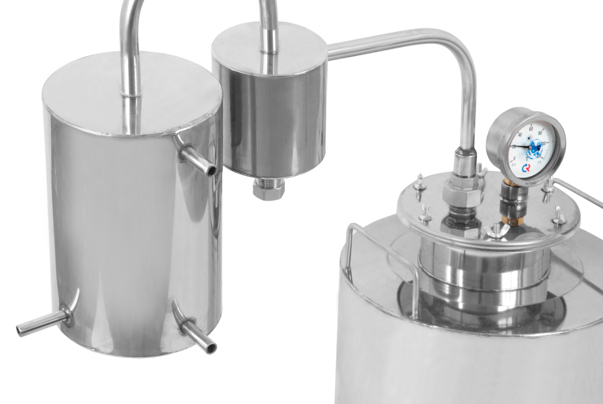 Высокое качество и чистота продукта. Сухопарник — это небольшая емкость, которая устанавливается между основным баком и змеевиком. Она проводит дополнительную очистку, отфильтровывает сивушные масла, тяжелые спирты и примеси и исключает попадание браги в готовый напиток. Так что сомневаться в качестве и чистоте продукта вам не придется.