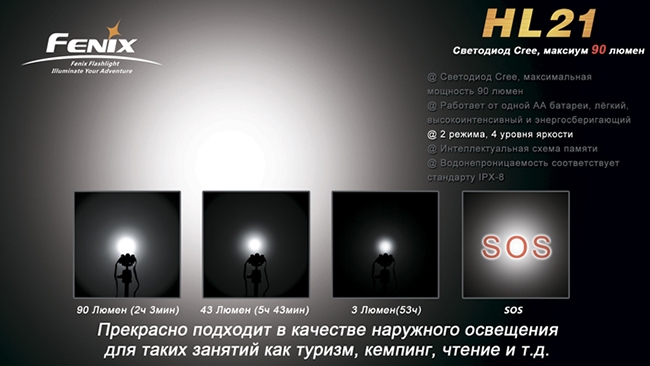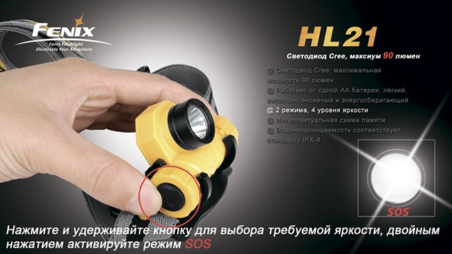 Всего же налобник Fenix HL21 имеет три основных режима освещения – 90 люмен (123 минуты работы), 47 люмен (5 часов 30 минут работы) и 3 люмен (53 часа работы). Помимо основных режимов, фонарик можно включать в режиме ритмичного мигания – SOS, он проработает до 15 часов. При выключении фонарик запоминает последний режим, которым Вы пользовались, и в следующий раз начнёт светить именно в этом режиме.