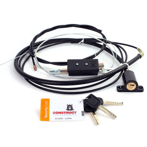 Construct HL-CM представляет собой механическую блокирующую систему, которая состоит из замкового устройства (корпус - цилиндр), управляющего запорным механизмом (ригель - кронштейн) с помощью троса в гибкой оболочке. Постановка на охрану производится нажатием на цилиндр замкового устройства, а снятие с охраны - поворотом ключа и вытягиванием цилиндра из корпуса замка.