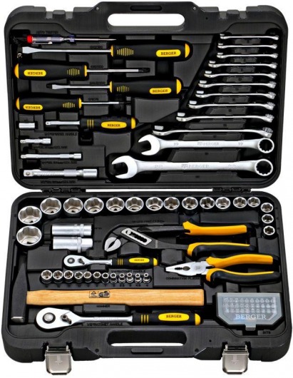 BERGER BG089-1214 — это набор инструментов для автомобиля, который включает в себя 89 предметов для устранения мелких поломок в автомобиле и небольшого домашнего ремонта. Данный набор автоинструментов содержит следующее оборудование: комбинированные ключи самых разных размеров, отвертки шлицевые и РН, молоток, пассатижи, автотестер, трещотку, биты, торцевые головки и многое другое. Всю комплектацию вы можете посмотреть в «Характеристиках», во вкладке справа.