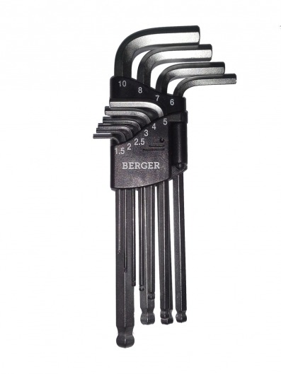 Набор шестигранников BERGER BG-10SНW позволяет закрутить или открутить все болты под шестигранный ключ. А т.к. зачастую размер болта-шестигранника наглядно определить сложно, то набор ключей — просто незаменимое оборудование для работы. Подобрав нужный диаметр, вы сможете выполнить свою задачу надежно и в минимальные сроки.