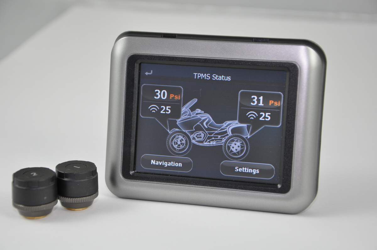 Датчики накручиваются на колесные вентили. После установки элементов питания, датчик начинает измерять давление и температуру. Полученные данные передаются на большой ЖК-дисплей, который вы можете установить в любом удобном месте в мотоцикле, и сразу же отображаются на экране. Дисплей комфортно отображает нужные данные. Если показатели выходят за пределы, которые вы устнавливаете, система предупреждает при помощи подсветки дисплея и звукового сигнала.