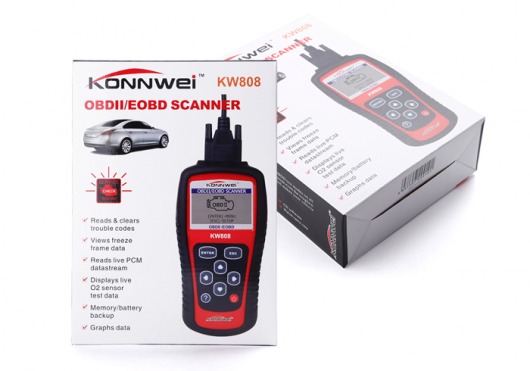 Konnwei KW808 — универсальный мультимарочный автомобильный сканер-тестер для диагностики автомобилей европейского, американского, а также азиатского производства. Устройство не только диагностирует неисправности, но и позволяет определить их причину посредством чтения кодов ошибок по протоколам OBDII и EOBD.