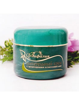 В состав входит сбалансированная комбинация натуральных масел и экстракт из 26 растений. Деликатная кремовая эмульсия интенсивно питает и увлажняет кожу лица, шеи и декольте. В состав косметического крема питательного «Вифалия» входят сбалансированная комбинация натуральных масел и экстракт из 26 растений, которые интенсивно питают кожу, при этом глубоко проникая в нижние слои эпидермиса. Комплекс витаминов А, Е, F и СО2 – экстракт из корица, облепихи, амаранта, липы восстанавливают защитную функцию кожи, активизируют процесс регенерации клеток кожи. Масло рисовых отрубей и масло жожоба повышают эластичность кожи и восстанавливают ее после сильных психо-эмоциональных стрессов. Подходит для любого типа кожи.