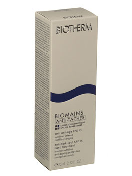 Антивозрастной крем для рук Anti-Taches (Biotherm) убирает пигментацию кожи, восстанавливает естественные защитные функции кожи, устраняет признаки старения. Благодаря УФ-фильтру SPF 4 и системы против свободных радикалов способствует исчезновению коричневых пятен. Помогает укрепить ногти, разгладить и смягчить огрубевшую кожу рук.
