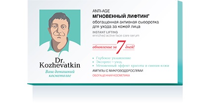 Ампулы с микроводорослями Мгновенный лифтинг (Dr. Kozhevatkin) обладают выраженным лифтинг-эффектом, стимулируют синтез волокон кожи, восстанавливают ее структуру, усиливая межклеточные соединения.
