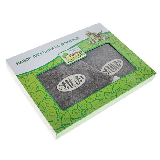 Шапка для сауны изготовлена из войлока, защитит голову от высоких температур. Без такой специальной шапки поход в сауну вообще не рекомендуется. В набор банных принадлежностей входит специальная войлочная рукавичка, которая поможет очистить поры вашего тела от грязи и шлаков, а также улучшит кровообращение во всем теле, что окажет благоприятное воздействие на весь организм в целом. Кроме того, в комплект входит мягкий удобный войлочный коврик, которым застилают лежанку.