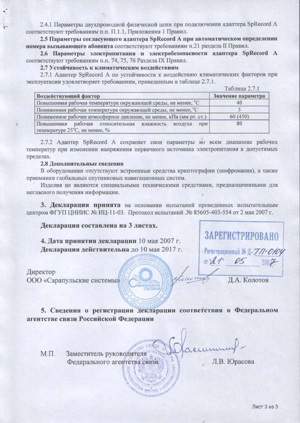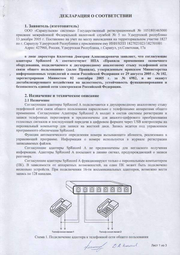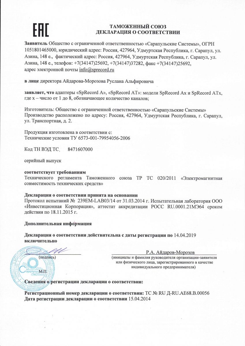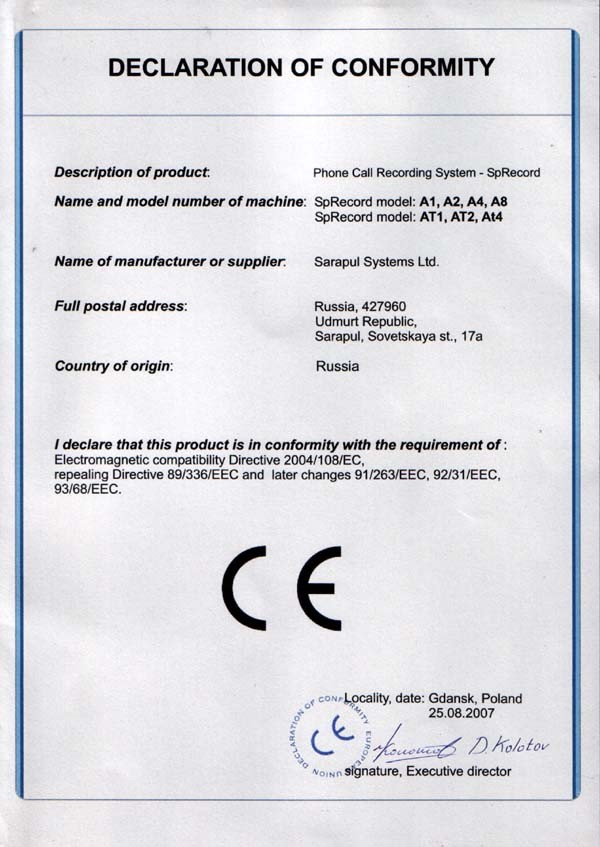 Устройство отвечает требованиям CE Евро Союза по электромагнитной совместимости (декларация) и имеет Свидетельство об официальной регистрации программы для SpyRecord.