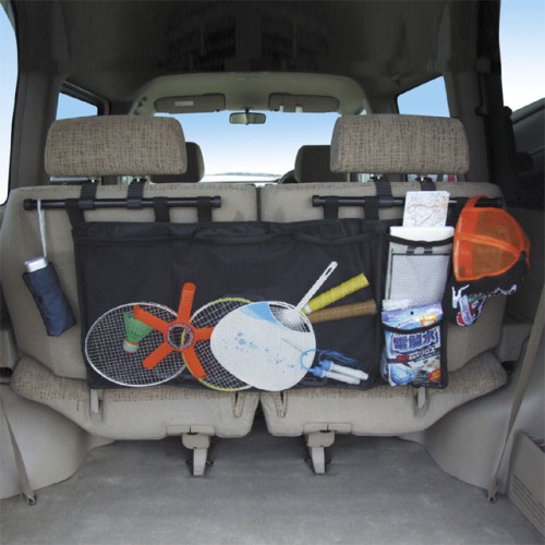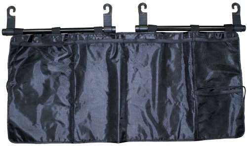 Сумка в багажник автомобиля RV-57 ориентирована на автомобили с кузовом типа "хэтчбэк" и "универсал", которые имеют задние сидения со съемными подголовниками. Сумка имеет 1 основной карман (675х360 мм) и 2 кармана поменьше (195х180 мм). Для того, чтобы установить сумку нужно просто приподнять подголовники заднего сидения и закрепить специальные регулируемые крючки на направляющих подголовников, после чего установить подголовники в исходное положение.