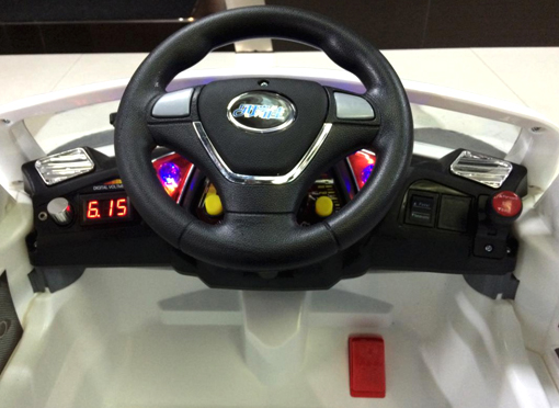 На приборной панели удобно расположились кнопка запуска и рычаг переключения скоростей. Приятная подсветка торпедо — дополнительный плюс. Еще одна "фишка" этой модели детского авто — открывающиеся двери с зеркалами заднего вида.