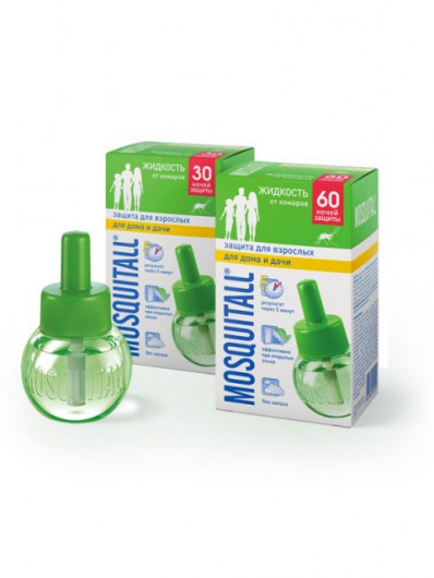 Жидкость для электрофумигатора MOSQUITALL "Защита для взрослых. Для дома и дачи" рассчитана на 30 ночей надежной защиты вашего дома от комаров. Вне зависимости от того,  будь то городская квартира или загородный дом, действующее вещество жидкости гарантированно уничтожает всех комаров внутри помещения площадью в 15 квадратных метров уже через 20-30 минут даже при открытых окнах! При этом жидкость Москитол не имеет запаха и полностью безопасна для людей и животных.