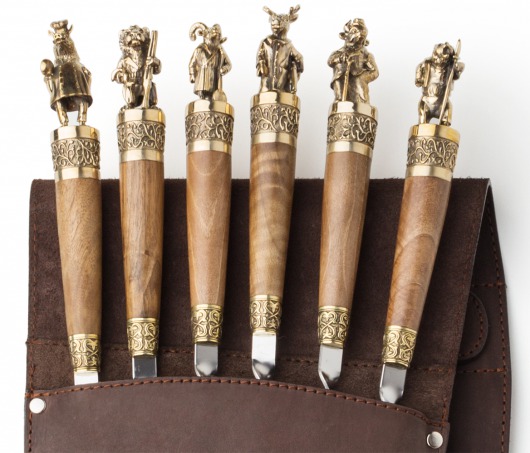 Особого внимания заслуживает ореховая рукоятка с литым бронзовым фигурным наконечником. Каждая фигурка — это автроская ювелирная работа. Ручка крупная, массивная, хорошо лежит в руке и при этом не перевешивает шампур.