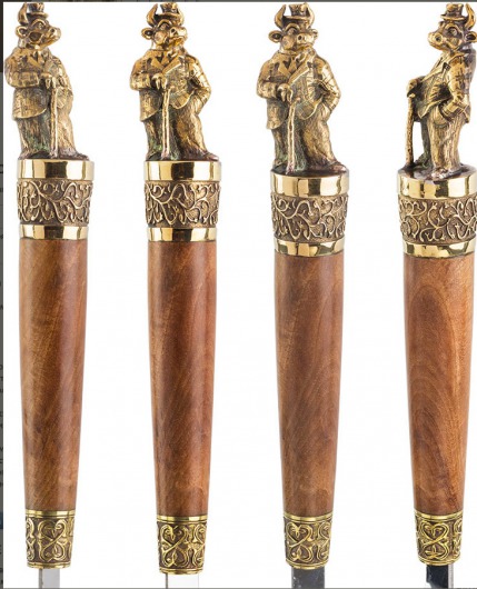 • Особого внимания заслуживает ореховая рукоятка с литым бронзовым фигурным наконечником. Каждая фигурка — это автроская ювелирная работа. Ручка крупная, массивная, хорошо лежит в руке и при этом не перевешивает шампур.