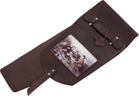 Все шампуры хранятся в оригинальном чехле из натуральной кожи, который украшен репродукцией знаменитой картины Перова "Охотники на привале" и внешне напоминает колчан для стрел.