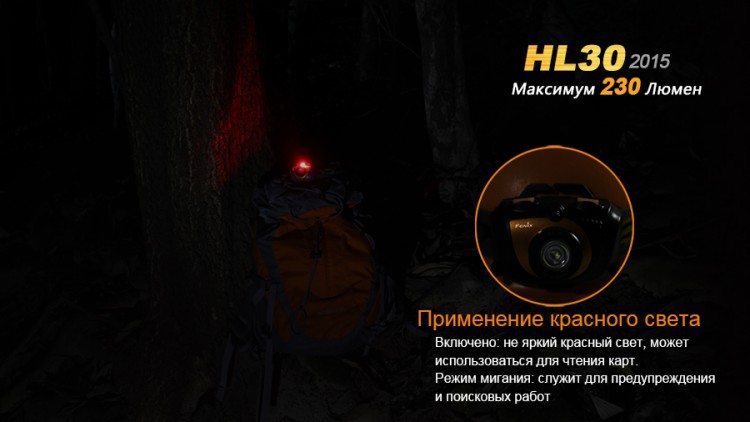 Помимо основного светодиода, в систему фонаря вмонтирован и дополнительный — красный Nichia red light LED. Его яркость всего 1 Люмен. Но этот свет можно эффективно использовать в качестве маячка, чтобы отыскать необходимое место (например, оставленный в темноте рюкзак или палатку). Такой красный свет не слепит человека при включении и отлично подходит для использования внутри палатки.