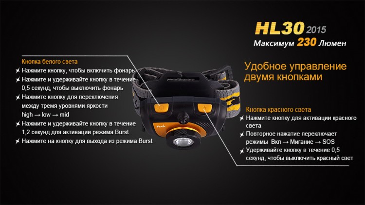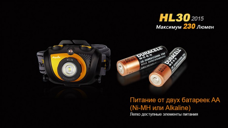Налобный фонарь Fenix HL30 2015 светит с яркостью до 230 люмен и работает на базе двух элементов питания формата АА. Этот фонарь вполне может работать под дождем и не боится грязи, а потому он станет хорошим помощником в туристических походах, выездах на рыбалку или иного вида активного отдыха на природе.