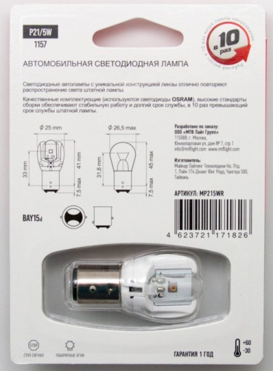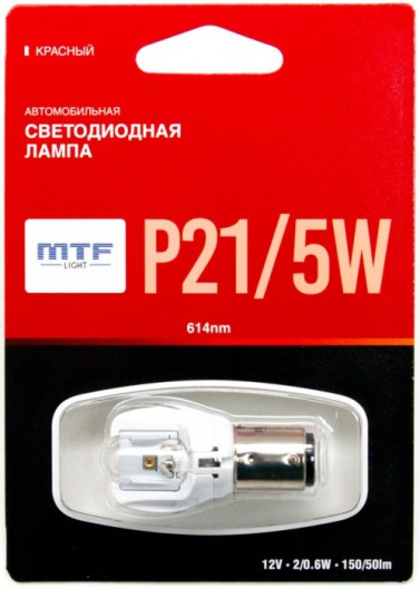 Светодиодная лампа MTF Light P21/5W 2/0.6W с уникальной конструкцией линзы отлично повторяет распространение света штатной лампы. Цвет свечения автолампы: красный.