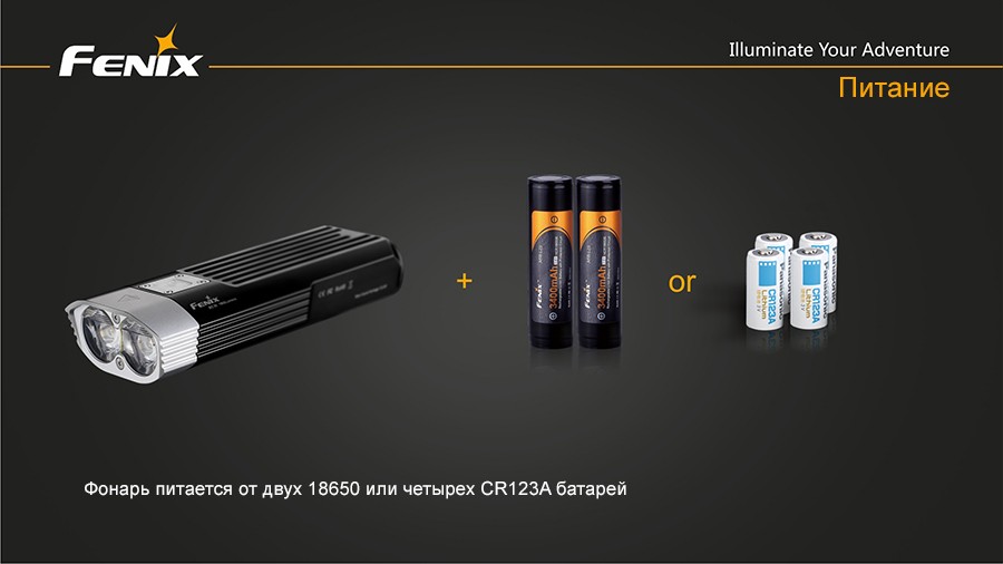 Продолжительность работы фонаря в том или ином режиме рассчитано исходя из комплектации аккумуляторами Fenix ARB-L2S 3400 мАч. В батарейный отсек, который встроен в корпус фонаря, помещается 2 аккумулятора формата 18650 либо 4 типа CR123A. При этом, производители накладывают некоторые ограничения на использование разных типов аккумуляторов, которые оговариваются в разделе «Инструкция по использованию».