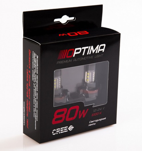 Светодиодная лампа Optima DRL CREE 80W H11, H9, H8, H16 12-24V 5100K – это лампы с увеличенной светоотдачей. Такие показатели достигаются благодаря использованию современных технологий CREE. Лампы Optima работают эффективнее, характеризуются более мощным световым потоком.
