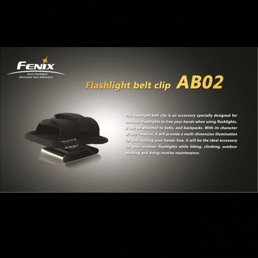 Клипса-держатель под названием Fenix AB02 совместима со множеством различных моделей фонарей из серий E, LD, PD, TK, UC. Для каждого из них такая клипса открывает возможность постоянно быть доступным для использования. При этом, руки владельца фонаря остаются совершенно свободными. Аксессуар представляет собою широкую стальную клипсу с кронштейном, положение которого легко регулируется. На кронштейне располагается тканевый синтетический чехол с фиксирующим ремнем, который закрепляет положение фонаря по отношению к клипсе и исключает его случайное падение на землю во время использования. Чехол предусматривает возможность полного поворота кронштейна вокруг своей оси. Таким образом пользователь может свободно регулировать необходимое направление для освещения.