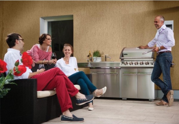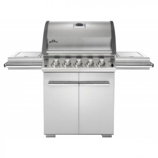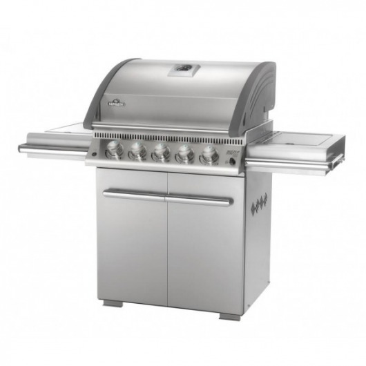 В комплектацию входит: основной корпус гриля из нержавейки, две стальные решетки для готовки (основная и вспомогательная), встроенный термометр, пять основных горелок и две дополнительных, фиксируемые колеса, боковые столы.