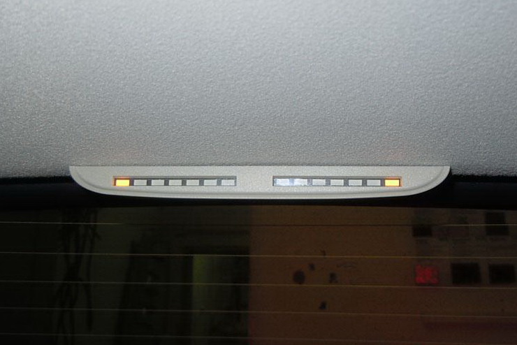Цифровое табло отражает расстояние до ближайшего препятствияПо мере приближения к препятствию на шкалах загораются 2 зеленых, 2 оранжевых и 2 красных сектора.