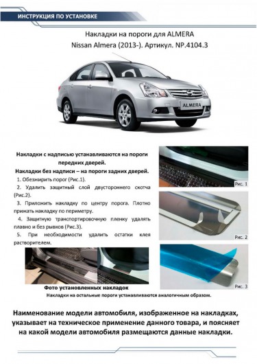 Вопросы и отзывы про Накладки на пороги для Nissan Almera от 13 г.в. (Rival)