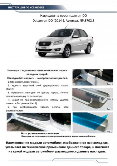 Данные накладки на внутренние пороги «Риваль» разработаны специально для автомобилей Datsun on-DO от 2014 г.в. и полностью повторяют их геометрию. Кроме того, накладки порогов двери Rival очень легко и быстро устанавливаются. И при этом надежно крепятся за счет плотного прилегания морозостойкого скотча.