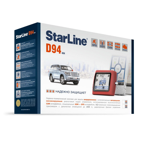 Новинка 2012 года! Автосигнализация с обратной связью StarLine D94 2CAN GSM SLAVE — первый в мире охранно-телематический комплекс для внедорожников с функцией автозапуска двигателя. Новинка использует защищенный от сканирования диалоговый код, интегрированный мультисистемный CAN и устойчивый к помехам трансивер с дальностью работы до 2.000 м. Кроме того, сигнализация StarLine D94 GSM имеет встроенный GSM-модуль, который позволяет вам управлять системой с помощью мобильного телефона, а также отслеживать местонахождение своего автомобиля. Охранная система StarLine D94 GSM - серьезная защита для серьезного автомобиля!